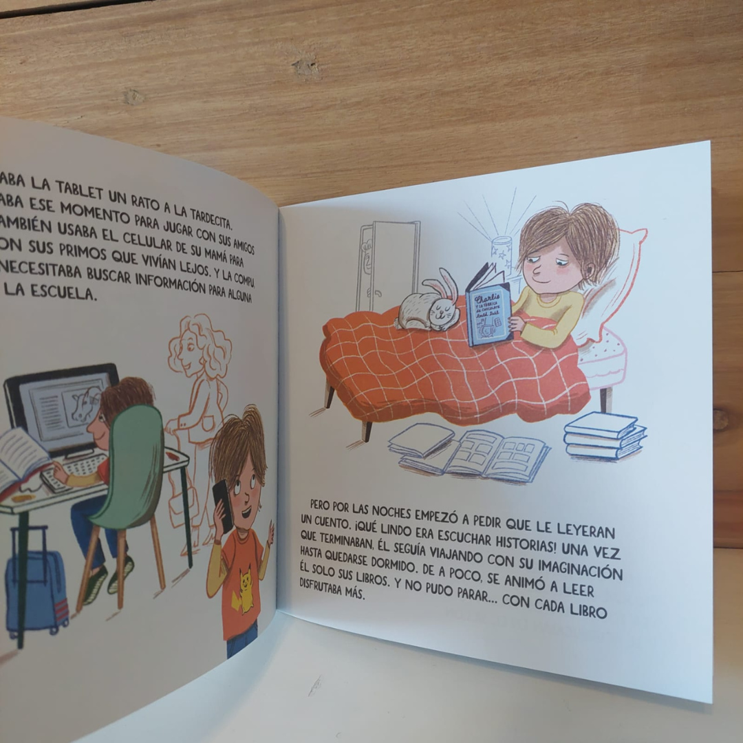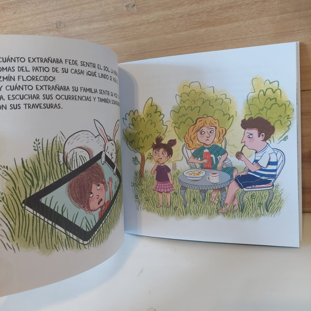 A Fede le encantan las pantallas. Las mira día y noche. Hasta que una mañana, mientras desayuna sumergido en un jueguito en el celular, ¡plop!, se cae adentro. Desde su mundo virtual, solo puede mirar el mundo real y empieza a extrañar eso que antes ya casi ni registraba: las tardes en familia, los encuentros con amigos, jugar al aire libre. Así, Fede aprende que las pantallas son divertidas y pueden ayudarnos en distintas situaciones, pero lo más importante está afuera, en el encuentro con los otros, en un abrazo, una caricia, una risa compartida.