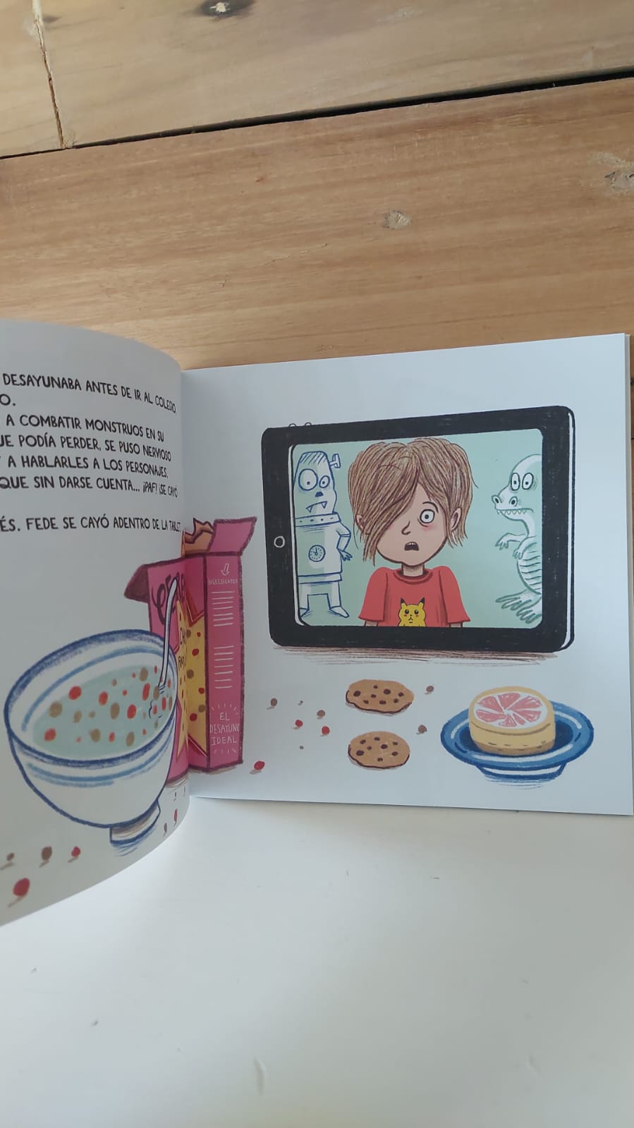 A Fede le encantan las pantallas. Las mira día y noche. Hasta que una mañana, mientras desayuna sumergido en un jueguito en el celular, ¡plop!, se cae adentro. Desde su mundo virtual, solo puede mirar el mundo real y empieza a extrañar eso que antes ya casi ni registraba: las tardes en familia, los encuentros con amigos, jugar al aire libre. Así, Fede aprende que las pantallas son divertidas y pueden ayudarnos en distintas situaciones, pero lo más importante está afuera, en el encuentro con los otros, en un abrazo, una caricia, una risa compartida.